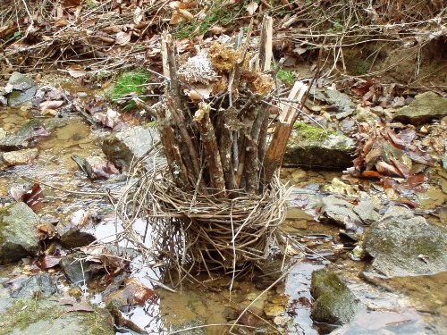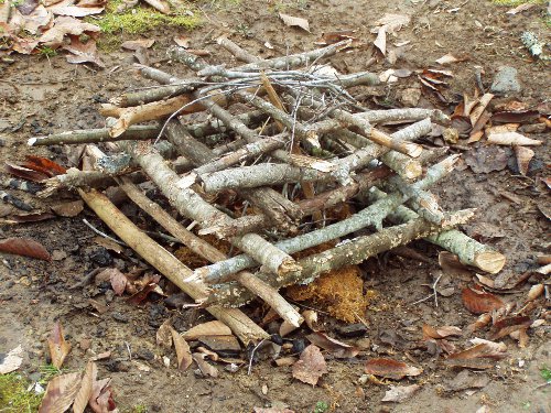 This is a name that I have attached to a variation of the Swedish Log Candle. The Swedish Log Candle is a fire log that is split or cut lengthwise into wedges, using an axe or chain saw in the process. The bundle-up can be made without tools using broken pieces of wood that are wrapped together with vines, cordage or wire. Longer pieces can be placed on the outside with shorter ones in the center. This creates a slight bowl area into which a mound of kindling and tinder is placed and lit. This aspect resembles the inverse fire structure. The advantage of the bundle-up is that it raises the fire off the ground and can be used in watery areas. Binding the bundle low allows for the longest burn time from above.