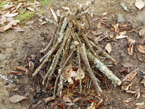 The cone shape of this campfire takes advantage of the rising heat produced from the lit kindling located inside at it’s base. Like a teepee, an initial tripod of sticks with interlocking branches can be placed to support additional sticks that are leaned against it. Some of the sticks may need stability that can be gained by pressing the bottom ends into the ground. At some point this structure will collapse, but will hopefully provide the critical mass required to ignite fuel sized branches that are subsequently placed on top of it.