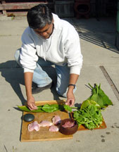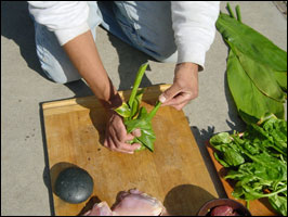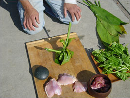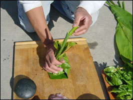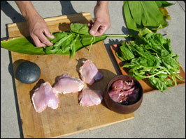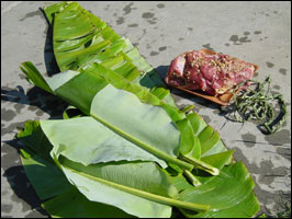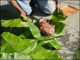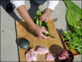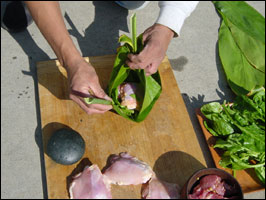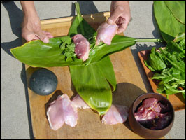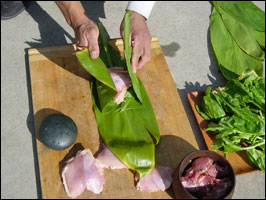 Photos 25 to 33 - Wrapping spinach leaves, slices of pork, and chicken in a bundle of 2 overlapping ti leaves. The two ti leaves are laid perpendicular to each other, as shown in Photo 27. The stem of the last ti leaf is tied in a half hitch around the bundle to secure the package. This ti leaf cover is called laulau. Taro leaves were traditionally cooked in the laulau instead of spinach leaves.