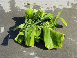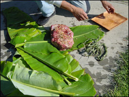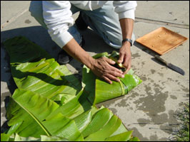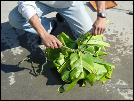 Photos 19 to 24 - Wrapping and tying the pork butt in a bundle of overlapping banana leaves. The leaves are laid in consecutive perpendicular positions to each other. The entire bundle was tied with a New Zealand Flax leaf that was sliced into strips and braided into cordage.