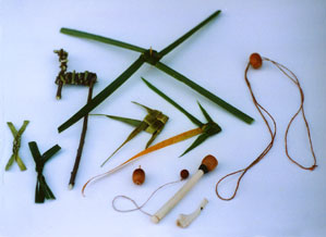 made out of nuts, leaf puzzles, willow deers, leaf whistles, tule bittern, cattail