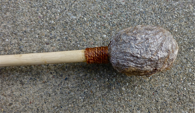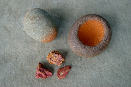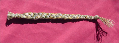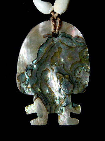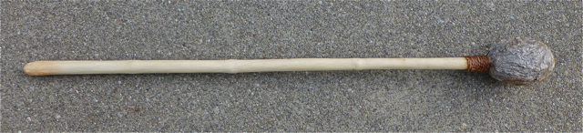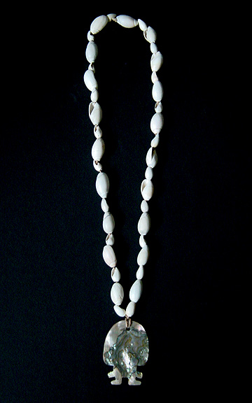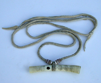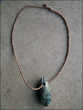 Serpentine "charmstone" pendant. Cordage made from dogbane fibers.