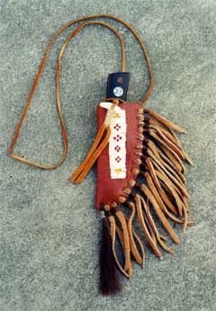 Knife sheath worn around the neck. Quill artwork on the front of the sheath.
