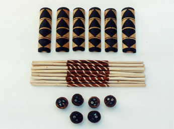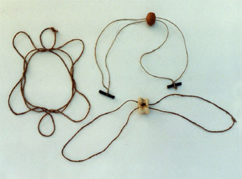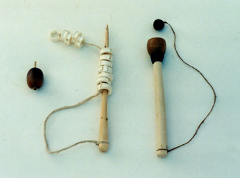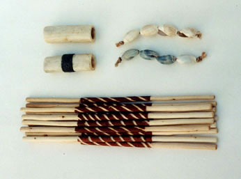 Hand games: bones (cow), olivella shells, and counter sticks.