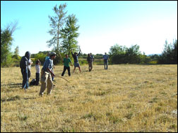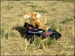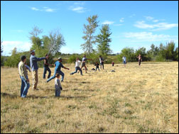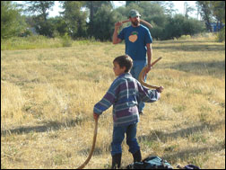 Paul Campbell introduces his rabbitstick throwing class. Participants learned the proper techniques for throwing a curved, non-returning hunting tool made from scrub oak. Someone mounted a stuffed bunny to a remote control car and allowed the novice rabbit hunters to throw at a moving target.