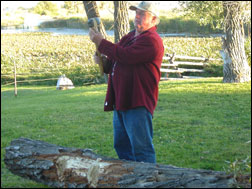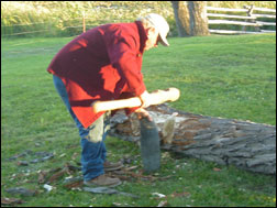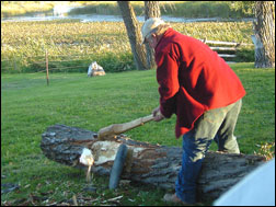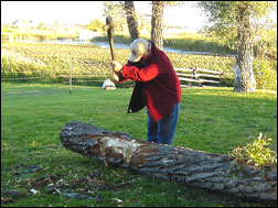 Larry Kinsella talks about his demonstration with the huge stone celt. A similar artifact was found in an archeological site. During the demonstration, small hand celts were used to chop some of the wood from the log. The huge celt was utilized for breaking the remaining section of the log in half. Unfortunately, the final stroke with the big stone celt fell at a wrong angle and broke the wooden handle at the section of the hafted celt.
