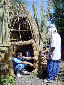 "Outside Educators (Dino Labiste & Sue Labiste) coordinated with the Math/Science Nucleus to build an Ohlone-style tule house at the Tule Ponds, Tyson Lagoon Wetland Center in Fremont. High school students, who needed community service hours, and volunteers helped with the gathering of the materials and the construction of the tule house."