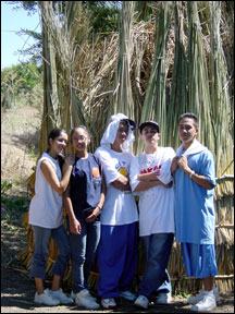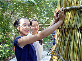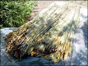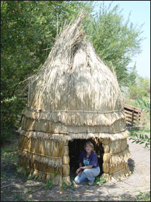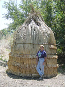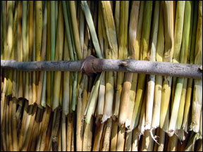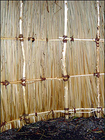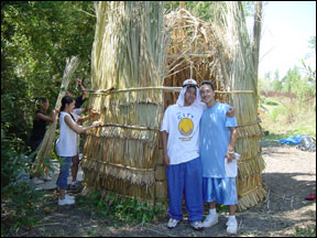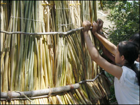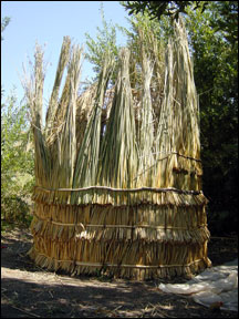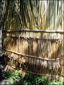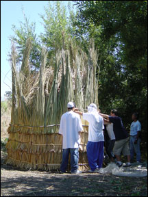 We rehydrated the tules that were previously gathered. On August 6, 2005, the third layer of tule thatching was completed. This work crew was much more efficient in coordinating their work efforts and were able to add half of the fourth layer of tule thatching to the house.