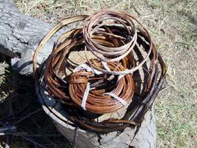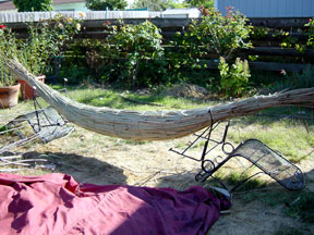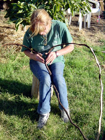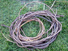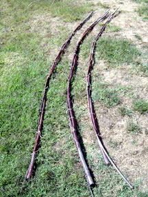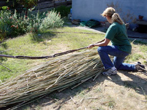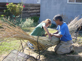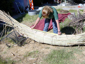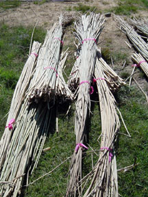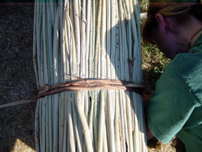 A core of willow saplings provided shape and rigidity to the bundled tule form. The materials utilized for lashing in the photographs were 2-ply cattail cordage and split grape vines. Long willow withes and dogbane cordage were also used for tying tule boats together.
