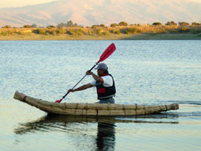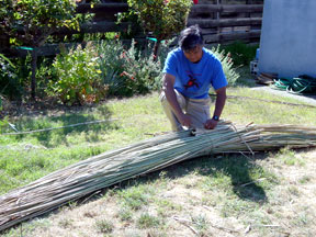 The following article is a pictorial process of the construction of a tule boat. The main material used is tule, a bulrush of the genus Schoenoplectus (formerly Scirpus). Tule grows in wetlands or areas of seasonal flooding. The interior of each long tule stem is filled with spongy tissue packed with air cells. It is the pithy interior of the tule stem that makes it such a unique and useful form of water transportation. Tule boats, or tule balsas, were used by California Natives to travel across inlets, deep marshes, lakes and bays.