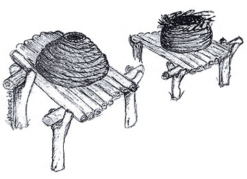 There are drawings of storage baskets hung in trees, or supported