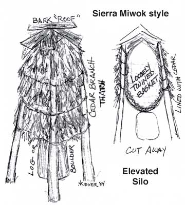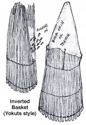 California Native Peoples stored many different kinds of seeds, but are best known for storing acorns. In many parts of the state, this was the main source for plant calories. In the southern deserts, pine nuts and mesquite beans supplemented or took the place of acorns, and were stored in similar granaries. Smaller seeds were stored in tight baskets hung inside the houses, as were acorns in areas where they were a smaller part of the diet. Separate silos from the great Central Valley, the mountains of the north and east, and parts of the desert south are illustrated here.