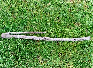 A simple atlatl can be made from a tree branch. Look for a straight branch with a smaller side branch extending out at an angle. An ideal angle for the smaller side branch would be 40 to 45 degrees from the main branch. Less than 40 degrees would work, but the smaller branch should not be parallel and lay flat to the main branch. The diameter of the smaller branch, which will become the spur, should fit the size of the notch hole on your dart. Also, be sure that the main branch is large and comfortable enough to fit in your hand. Too small of a size will be unstable during the throwing of the dart. The length of your simple atlatl is subjective, although I would not go smaller than 11 inches. Various type of woods may be used for your atlatl. Try not to get a branch that is too soft and too flexible.