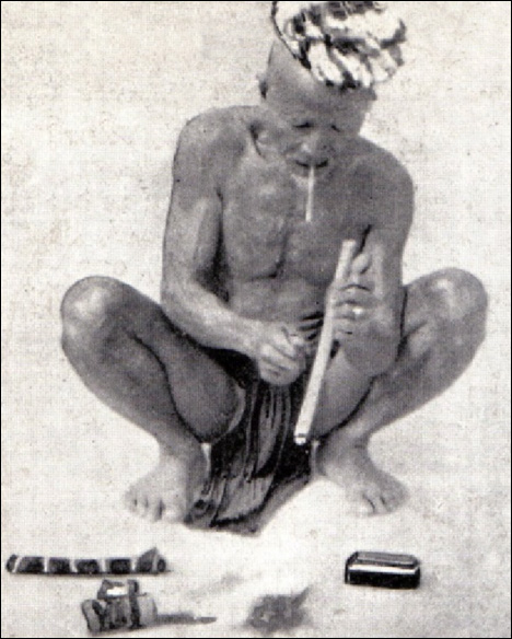 Figure 1 - Bornean man lighting his cigarette with a bamboo strike-a-light (Tillema, 1938).