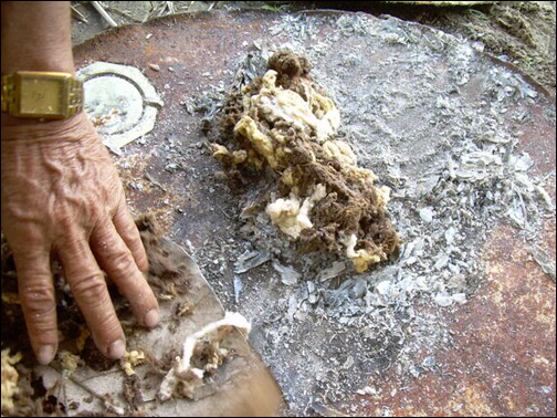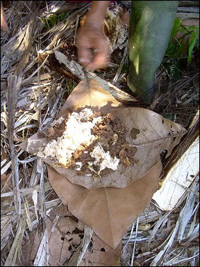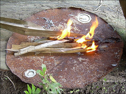 We laid the fluff from the inner layers out in the sun to dry. Later we charred giant pandanus to add to the dry fluff.