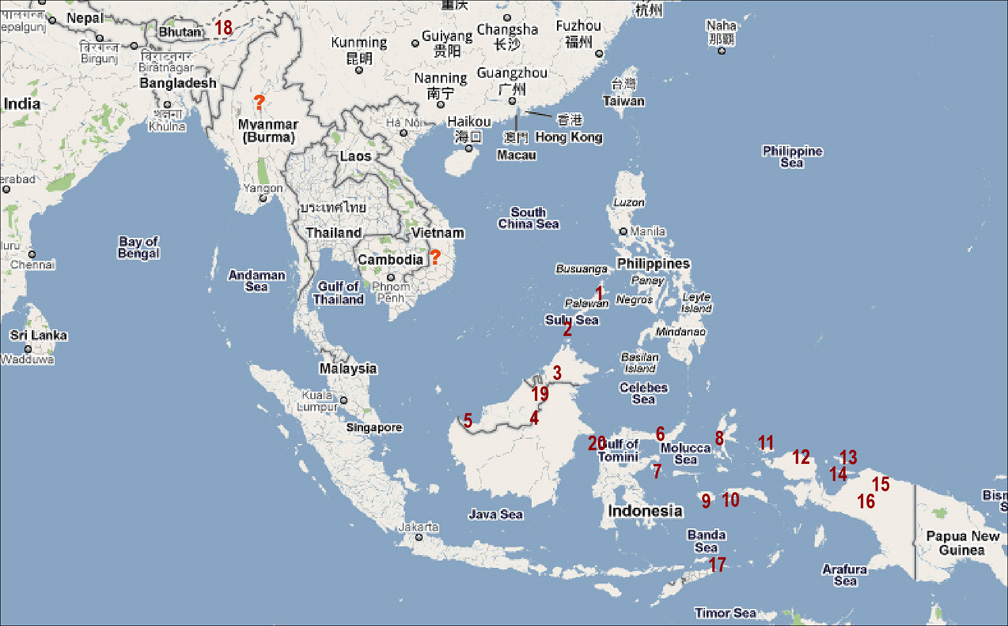 3. Sabah (several locations) Borneo, Malaysia (Skertchly, 1890, Roth, 1896, Rutter, 1929)