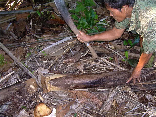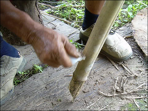 There are at least three fire bamboo species – Schizostachyum jaculans in continental Asia, Schizostachyum iraten in Java and the Borneo one, which has yet to be definitively identified. Ed’s job is to do the DNA analysis. Professor Wong told me that he believed S. jaculans was a ‘village’ bamboo, meaning it was domesticated, much like cats and dogs, because of its use as a cooking utensil, blowpipe (due to the two yard plus internodal lengths) and for basketry. He has not found S. jaculans anywhere more than a kilometer (600 yards) from the site of an existing or derelict aboriginal settlement. He was not aware of the spiritual use of these bamboos. I was able to confirm that these bamboos traveled with the Iban head-hunters when this lively, war-like, democratic, and entrepreneurial tribe spread across Borneo Island. Strangely enough, in continental Asia, none of the aboriginal tribes I spoke to knew of the bamboo strike-a-light, even though they had the same bamboo in their backyard. Instead, they used it for making blowpipes and other things. However, some other Borneo tribes also know how to use the bamboo strike-a-light.