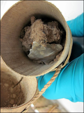 ". . . . To start a fire, the striking stone is held in one hand with bits of palm fuzz, charcoal, and leaf tinder that ignite from friction on about the third or fourth strike of the stone striker against the bamboo tube. The internodal section of bamboo that is both a container and a striking surface must be brittle from dryness to function successfully as the striking surface. It is presumed that the silicon dioxide (SiO2) phytoliths within the bamboo play a role in creating a hard, brittle surface against which a stone striker can produce either a spark or heat induced friction to ignite the special tinder."