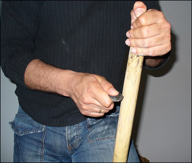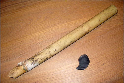 I've studied the bamboo strike-a-lights figured in Walter Hough's book that are held at the Smithsonian. I've held them in my hands and looked at them very carefully. I've looked at the tinder and compared it to that with the numerous fire pistons. The bamboo looked exactly like the bamboo I use in one of the videos, the one where I am in the workshop. It's Schizostachyum lumampao as far as I can tell. Schizostachyum is a genus of tropical bamboo with species having long internodes, some reaching over a meter. They are used for making blowguns and numerous household articles. They require warm temperatures. I am searching for a usable bamboo that can grow year round in our southern California climate. The bamboo strike-a-light bamboo has a hard rough epidermis when mature and dry. I have tried using fresh cut bamboo with no success of obtaining sparks. I only got the burning smell. Bamboo can be relatively green while dead and standing. . . . You can experiment with bamboo in your area, that is found at stores, or any bamboo articles you may have. I noticed that my bamboo steamer is made out of a very similar bamboo as the strike-a-light. You will feel a degree of roughness as you run your finger over the epidermis.