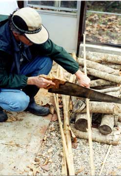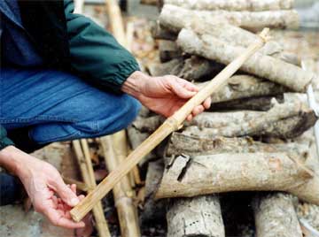 Tiny droplets of rain sprinkled onto the glass panes as Ken and I stepped into his greenhouse on a wet and overcast Monday. The day was not the ideal time to photograph knapping techniques for the website. It was cold and damp, but it was a holiday and we had the free time to make the best of it. Lying on the ground were stalks of bamboo that Ken pushed aside to clear the area. "Do you need any bamboo?," he asked. "Not particularly. I can't think of any future projects right now," I replied.