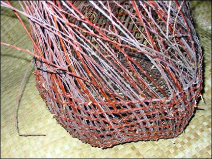 The technique I had learned for adding in whole shoot twiners seemed to have been created with those end lumps in mind - you wrap the tapering end of the spent twiner around the large end of the replacement. Cut ends have minimal taper and pull out easily until worked in to the pattern. A technique for adding ribs into close twined Paiute baskets involved fattening the base of the rib by chewing on it, thus making it more secure. Both of these techniques were suggestive that they had originated with pulled off stems.