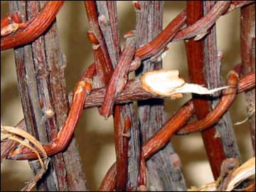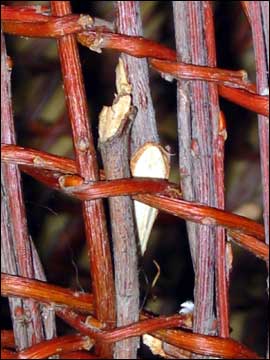 Back in the Bulletin of Primitive Technology issue #21 (pg 37), Alice Tulloch posed a lithic challenge. Her "Figure 2" showed twiner sized stems harvested by pulling them from the main stem of willow or redbud. These showed a characteristic lump where they were torn from the branch (and a tail of bark). Her challenge had to do with harvesting material too large to break off this way, but too small in diameter to cut with a stone saw or axe efficiently. Solutions to her challenge were offered by myself in the Bulletin of Primitive Technology #22 and by Goode Jones in the Bulletin of Primitive Technology #23. The image of the pulled off stems with their lumpy ends stayed with me.
