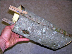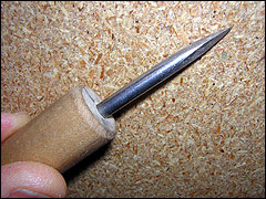 Sewing up your basket will require a pointed awl of either natural material (bone, wood, or antler) or metal. Dick and I used a nice design of his made by grinding a heavy-duty nail on three sides to a tapered, sharp point. The resulting cross-section is triangular. This design is helpful since the sharp edges tend to cut rather than tear through the bark. Next, you'll need material to sew or lace together your basket. We used commercial caning and split pine root for ours, but any good conifer rootstock will work for the purpose.