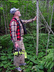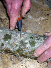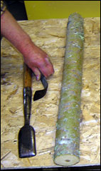 First we went off into a beautiful patch of Dick's northwoods acreage to gather our raw material. After looking at a number of trees, we selected a young "pople" (Populus sp.) about 5 inches in diameter and maybe twenty feet tall. This plant is considered to be a "weed tree", having taken over large areas that have long since been logged off. After felling the tree, we trucked it back to Dick's yard where we cut it into sections about two feet long. This length can vary, depending upon how long you want your finished basket to be. The finished piece will be roughly 1/2 the length of the initial log section. As always, be sure to get permission before harvesting your wood, or harvest from your own or a friend's property.