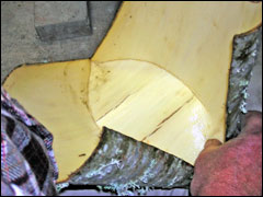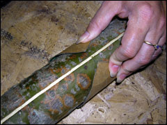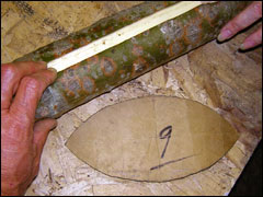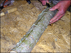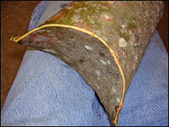 Measure to find the middle (lengthwise) of the "bark tube" and mark that spot near one of the cut edges. From thin cardboard, fabricate a "lens"- shaped pattern that fits nicely around the circumference of the bark, wrap it around at the midpoint, and trace around this form with a pencil. Now, using your sharp blade, carefully cut along this line. Note: This is a bit tricky to describe, since too shallow a cut will make the bark bending difficult, and too deep a cut will cause the bark to separate - about halfway through is a good measure. You may want to practice cutting and folding with some scrap pieces before going on to your basket piece.
