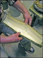 Now it's time to shape your basket! Slide out the log and place the bark on your leg as shown. Slowly bend the insides of the bark up and together, using your hands to help the cut lines bend. As the ends come together at the top, they should overlap about 3/4 inch. Pinch these areas together with clothespins while you prepare your sewing materials (Possible primitive substitute for clothespins: short split-sticks with binding on the unsplit end or the fingers of a willing assistant).