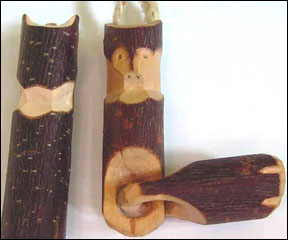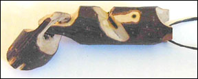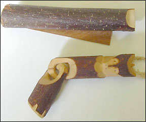 The Ulchi people of Siberia do all kinds of interesting wood carving. This little animal effigy is a typical example. It appeals to me because it illustrates how a few simple notches can transform a stick into an animal The original was shown to me by Tom Bassler of Sedro-Wolley, Washington. I don’t know anything about the myths, symbolism and folklore that accompany this figure and would welcome any enlightening comments.