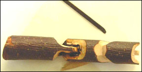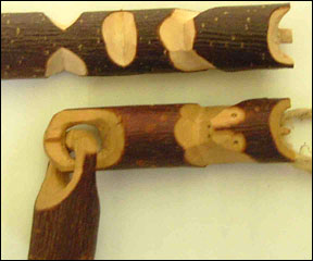 In the piece illustrated, I used a piece of steel from a street-sweeper brush as a combination wood-burner and micro-chisel to do the fine cutting necessary for separating the two halves of the chain link The steel, the street-sweeper bristles are made from, has a relatively high carbon content. It is ideal for wood carving tools. File or grind it to the desired shape, heat it red hot and quench it in water to harden it. Lastly, draw some of the temper by heating it in a kitchen oven to about 350 degrees F for about ten minutes. This will make the steel less brittle. For more enlightenment, read "The Shade Tree Knife Mechanic" article here in the PrimitiveWays website.