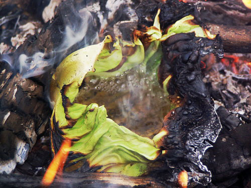 There are some guidelines that should be observed: the vessel should not leak fluids that would extinguish the flame or coal: if the vessel is flexible or fragile, it will need to be supported in the process. The best way to support the cabbage leaf is to place it on live coals that you have prepared in a cup-shaped mound. Immediately fill it with water to protect the leaf and hold it in place. Once the water comes to a boil, the challenge will be to extract it from the vessel. In this case a smaller vessel like a spoon or small cup can be used to draw out the hot water for use.