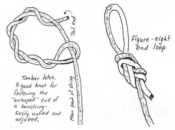 It is not essential to have a special plaited or braided loop (or eye) to fasten your string to your bow. One end can be tied with a timber hitch knot, and the other end can have a loop formed by a knot. To form the loop I do not recommend a bowline - I think this may weaken the string too much for a powerful bow. I prefer a figure-eight loop