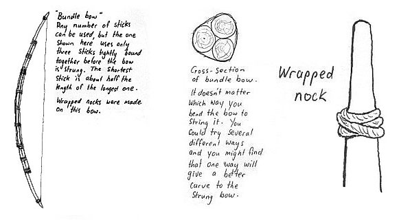 This bow is made from several, reasonably straight sticks (or similar objects) of fairly uniform thickness that are bound together into a bundle. A single, plain stick with a string tied to it will make a bow of sorts, but it may be likely to bend too much in the middle and be inefficient. An efficient bow carved from a single piece of wood will generally be quite tapered towards both ends to balance the leverage applied by the string so that the bow bends evenly throughout both limbs. A bundle bow is generally made up of sticks that are tied together in such a way to achieve a similar taper.
