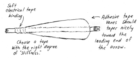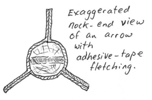 A big challenge with this tape fletching is to get three nice, flat, evenly spaced vanes. This should come with practice. Another challenge is to end up with the vanes where you want them in relation to your nock so that you get the conventional "cock and hen feather" configuration with the cock feather at right angles to the plane of the nock. If your fletching job isn't very neat, you may find that the arrow will still fly fairly well.