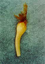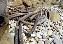 The Bull whip kelp was utilized by the Pacific Northwest Coast Indians for their fishing gear and storage containers. The bulb and parts of the stipe were used to steam bend branches of fir for their bentwood halibut hooks. The fir sticks were shaved to the right thickness and shape, placed in the kelp tubes, water was added and the ends were plugged with a wad of moss. The kelp tubes were buried in hot ashes of a dying fire and left to steam all night. The next morning, the kelp was split open and the steamed fir sticks were bent to shape and pressed into a wooden mold to cool. A lightweight storage container for eulachon oil was also made from the long kelp stems and bulb. The blades were trimmed off and the lower end was cut off to provide an opening in which to fill the long stems with oil. A funnel was made from another kelp bulb to pour the oil into the stem. The open end was plugged with a wooden stopper and tied tightly into place.
