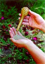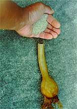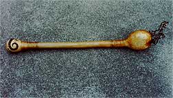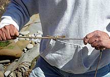 Fill the dried bulb with any rattle sounding material, like rice, seeds, pebbles, etc. Attach a stick to the open end of your kelp stem and lash it with cordage. You now have a kelp rattle. The finished rattle in the photo has a small gourd with pebbles attached to the other end of the stick.