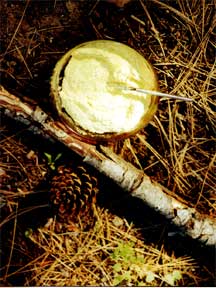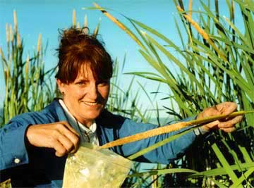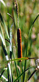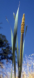 Step 2: Take a moment. Give some thought. This is a generous plant. Pre-contact Native American usage of the plant was extensive. The new green leaf stalks can be split out and eaten like celery. Cahuilla and Mountain Maidu Indians wove the mature leaf stalk into mats or other useful items. The male flower's edible pollen was used like flour. Immature flowers (male and female) were eaten while still sheathed. The bloom stalk can be used as a fire stick when thoroughly dry, though the Indians at San Juan De Padua were reported to construct flutes from the stalk. The same flower later produces cattail fluff, versatile as insulation, tinder, cradle board padding, and wound dressing. The root stalks (corms) are rich in starch, and can be processed as a food. Consider too the cattail's role in supporting the web of life. As we gathered the pollen, we were aware of geese and teal, muskrats, fish sheltered in the tangled roots, marsh wrens, blackbirds, and an invisible but vocal bittern. What isn't there to like about the cattail? Take a moment to say please. Take a moment to say thank you.