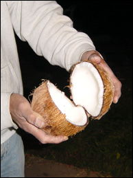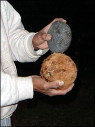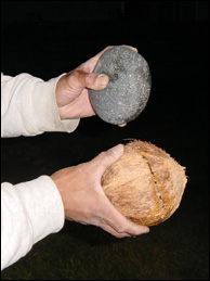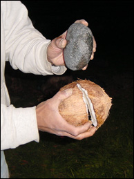 The stone is banged along the coconut's middle or greatest diameter. This causes a crack to form that will encircle the coconut shell. Rotate the coconut as you whack around the shell.