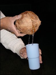 As the crack becomes wider, place a cup under the shell to catch the coconut water. If the coconut is not too old, the refreshing liquid can be quite sweet and delicious.