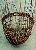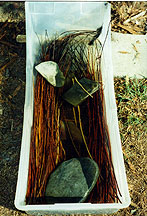 After gathering, the willow withes are completely dried, stored and then reconstituted later for use. This creates a finished twined basket that is stiffer and tighter. To reconstitute willow, the withes are completely submerged in a container of water. Flat stones are used to keep the withes from floating to the surface. After the willow becomes flexible, the material is woven into a utilitarian basket.