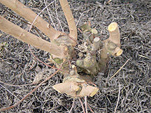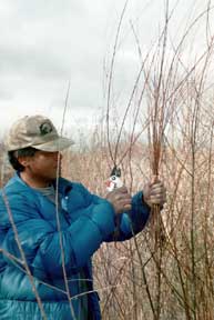 Hinds willow thickets in the wild have dense growth with lots of weak shoots all competing for the light. These dense thickets have the effect of taking all the light away from the plants and grasses growing underneath, eventually eliminating them. Most of the new branches and shoots in the spring become infested with insect larvae that make them undesirable for baskets. To control insect infestation and to cultivate the thin, long branches for basketry withes, a patch of willow is coppiced to provide an indefinite supply of branches. The willow regenerates itself, without the need for a continuous cycle of planting. The willow is pruned back while the plant is in its dormant stage during the winter season or early spring. This is the time of year when the sap is low in the plant. Generally, willows that are native to cool or cold-winter regions are dormant during their leafless period. The best time to coppice is when it will least shock the plant, which is when it is not actively growing.
