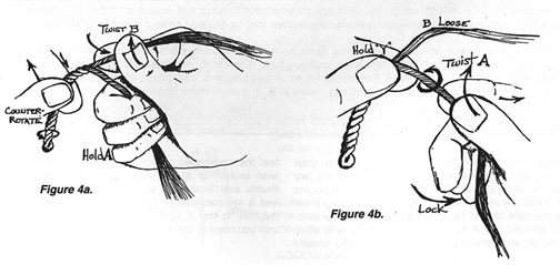 Counter-rotating, one form of finger-twisting, involves each hand applying a clockwise (S) twist into a ply, while passing the right ply over, and the left ply under (counter-clockwise or Z-plying). In Figure 3a, your left hand twists ply A clockwise, while your right hand does the same with ply B. At the same time, you pass ply B over and behind your left thumb and lock it in place with your remaining fingers, as in Figure 3b. You then take A in your right hand and B in your left and repeat, over and over and over again! These two methods are particularly handy with larger and coarser materials such as cattail and tule ropes.