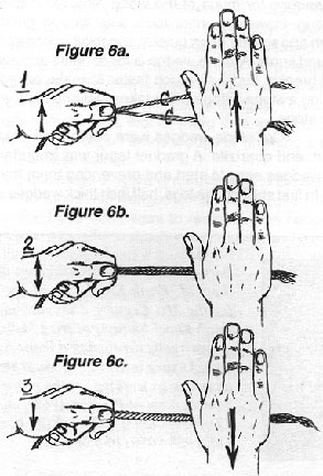 Finger-twisting methods are best used when a relatively small amount of string is being made and/or has to be very tight and even, and when very stiff or coarse materials are being used, such as cattail or tule. When making mass quantities of cordage, it is much faster and easier on the hands to use the leg (thigh) rolling method. The principle is the same, S-twist, Z-ply, but the twist is applied by rolling on the leg, rather than twisting between the thumb and finger. You can continue to work without getting cramps in your hand muscles, and you can (with practice) work faster (about ten feet per hour). The critical element in making this method work is having the right surface on which to roll. Traditionally the bare left thigh is used. If you do not want to expose your skin, or if your legs are hairy, you can use pants, but these should be tight around your leg, so they won't bunch up as you roll, and they should have a rough enough surface to give traction. Keeping them damp is also critical. I keep a bucket of water next to me while work. This method is illustrated in Figure 6a-c.