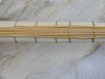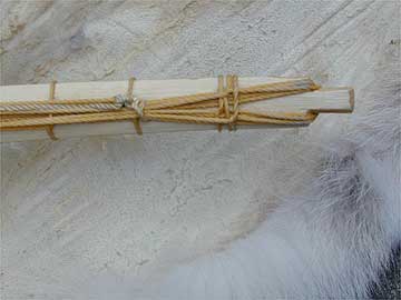 Mason (2) has some fairly detailed drawings of Inuit bows showing the methods used to attach the cordage backing. The main feature to observe is that they had many ways of doing it. Some made the nocks of the bow very deep and then passed the cord back and forth between the nocks. Other examples used "half hitches" about an inch below the nocks. The cord was secured to the bow limbs at several places between the nocks and handle section. Several being from 1 to 20. The one universal factor in all designs, I presume, is that the sinew cordage was tightened to be under great tension when the bow was in use. Typically this was done by inserting some sort of little toggle into the cord and twisting until it was tight. The cord was then bound in place and the toggle removed. After shooting the binding was removed to relieve the tension on the cord. Mason's book shows an ivory toggle which looks very much like the lever used to remove bicycle tires.