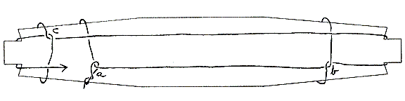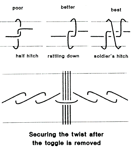 The cord I used was yellow nylon chalk line, about .05 inches in diameter, three strand twisted. My choice was based on what I had at the time plus the fact that nylon has elastic properties similar to sinew. Other sizes or materials could be substituted. Looking at (a) on Figure 3, first tie one end of the cord temporarily near the end of one limb. Next pull the cord to the other end of the bow and tie a knot as shown in (b). Different knots to use are shown in Figure 2. Pull the cord as tight as you can while you do this. Then bring the cord around the nock, pull tight and tie a knot at the other end of the bow (c). Continue doing this until you have six strands on each side.