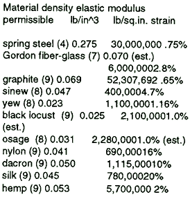 Measurements that I had made on sinew several years earlier showed that it had an elastic modulus of about 400,000 pounds per square inch and could be stretched about 5% before breaking. Hardy (4) claims an elastic modulus of 180,000 pounds per square inch and elongation of 4.1%. Nylon is clearly a good choice for imitation sinew in that its elastic modulus is about the same and it can be stretched even farther. As a side issue, one of the key features of sinew which makes it so superior as a glued bow backing is the fact that when glued to the back of a bow in the wet state it is elongated and as it dries it shrinks, putting it under considerable tension.