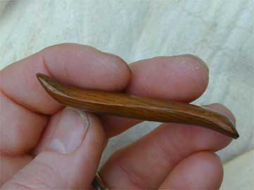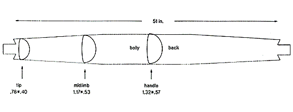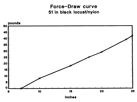 The wood came from a black locust tree cut in early July, about 2 inches diameter at the top end, split in half with a combination of sawing and wedge. The log was peeled, laid on the floor so that the curvature was in the plane of the floor, and marked on both sides with a felt tipped pen. Lacking a bandsaw I used a small pruning saw and a wedge to split it into two staves. The wood was roughly shaped while green and tied to a 2x4 to dry for all of three weeks. The final dimensions were: 51 inches between the knocks, handle: 1.32" x .57", midlimb: 1.17' x .53", tips: .78" x .40". The cross sections were flattened ovals (semi-ellipses) with the belly side considerably flatter than the back. Absolutely nothing was done to the back except bark removal and light sanding. The bow is about 90% sapwood. I did the initial drying between tillerings by sticking the bow in the back window of my car in the direct July sun, an idea suggested by Paul Comstock (3). It dried very quickly that way. The first attempt broke while being strung, maybe because I tried stringing it while it was still very warm from the back window. The second half of the log was successfully tillered at about half draw before putting the cordage backing on. I didn't go to full draw before adding the cordage back because I thought it might break. It now draws 24 pounds at 20 inches before the cordage is cinched up and 29 pounds at 20 inches after cinch-up. At full draw, 25 in. it pulls 42 pounds. A cardinal rule of the traditional American/European bowyer which I broke was to make the bow from essentially green wood.