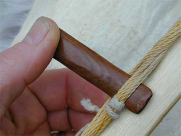 If the nocks aren't deep enough the cord will slip off. This can be remedied by tying the bundle of cord together near each nock, making sure the nocks are deep enough and tying "half hitches" near each end. You don't want any constraint on the cord in the middle 2/3 of the bow so you can twist the cord to make it tight. This puts it at risk from sliding off the back of the bow when it is at full draw. This can be prevented by providing an additional binding around the handle after the cord has been twisted tight. Pass a fairly heavy cord through the gap where the toggle is located several times and tie it around the handle. Then pull the toggle out. The cord should stay twisted and not move from the center of the handle section.